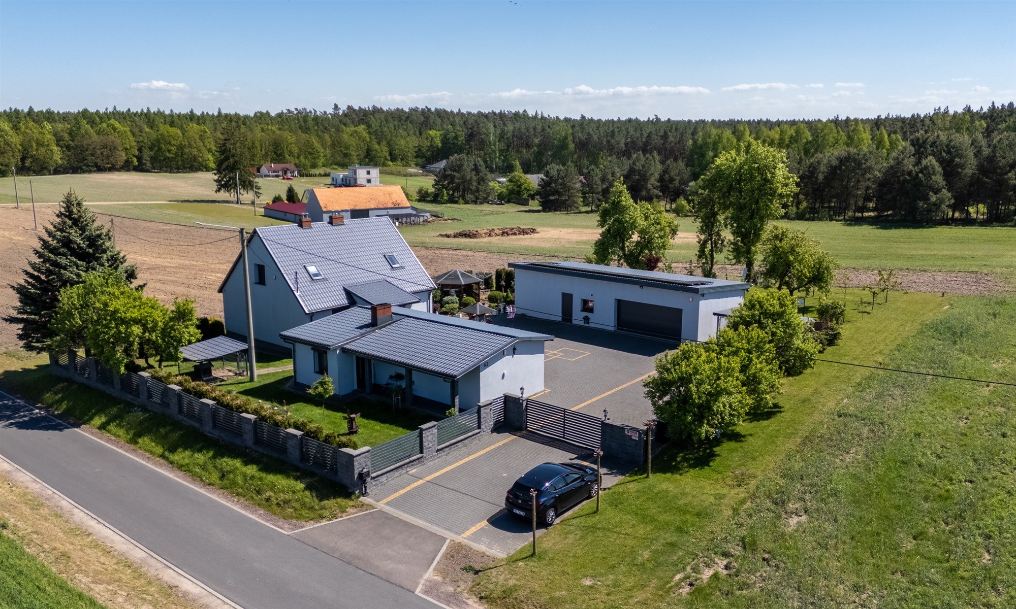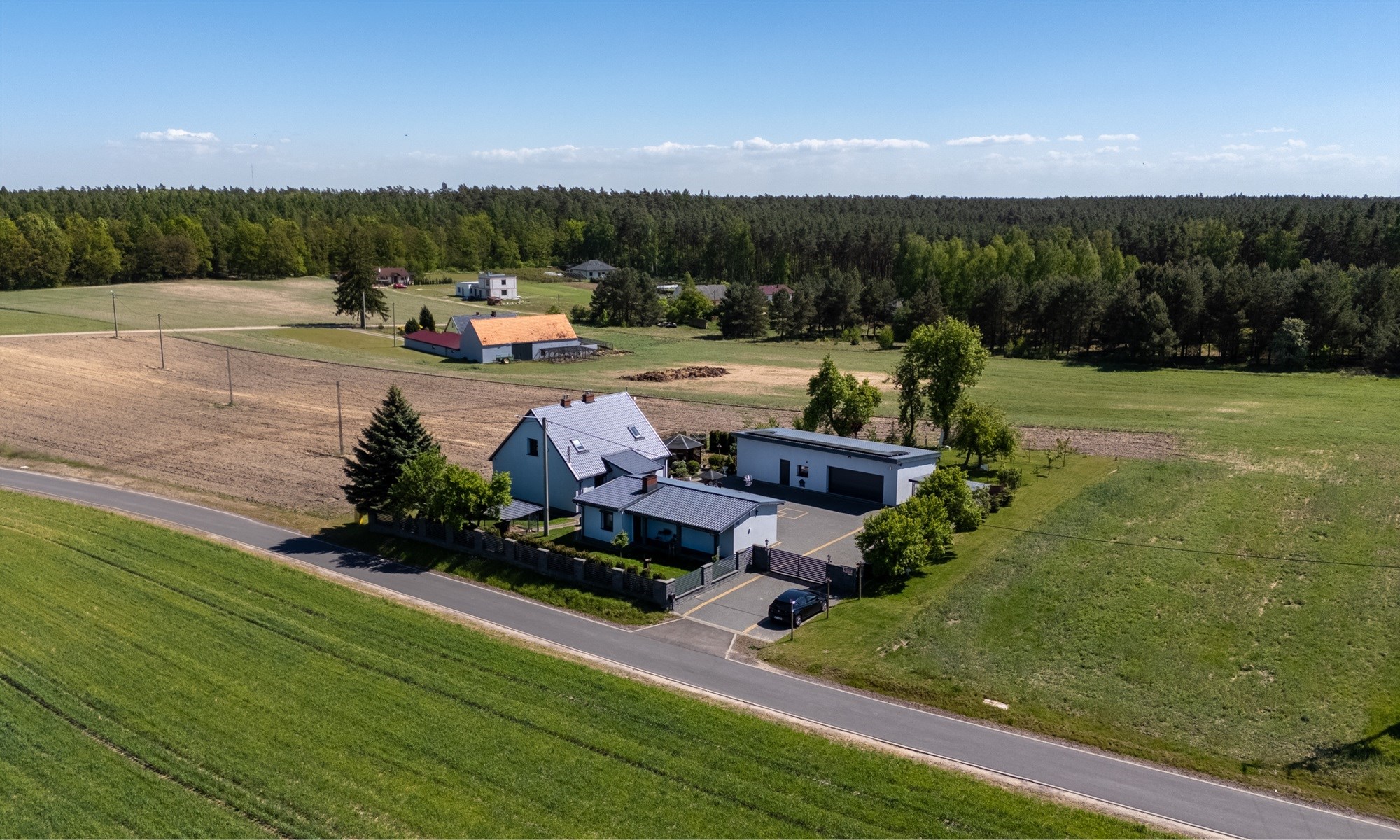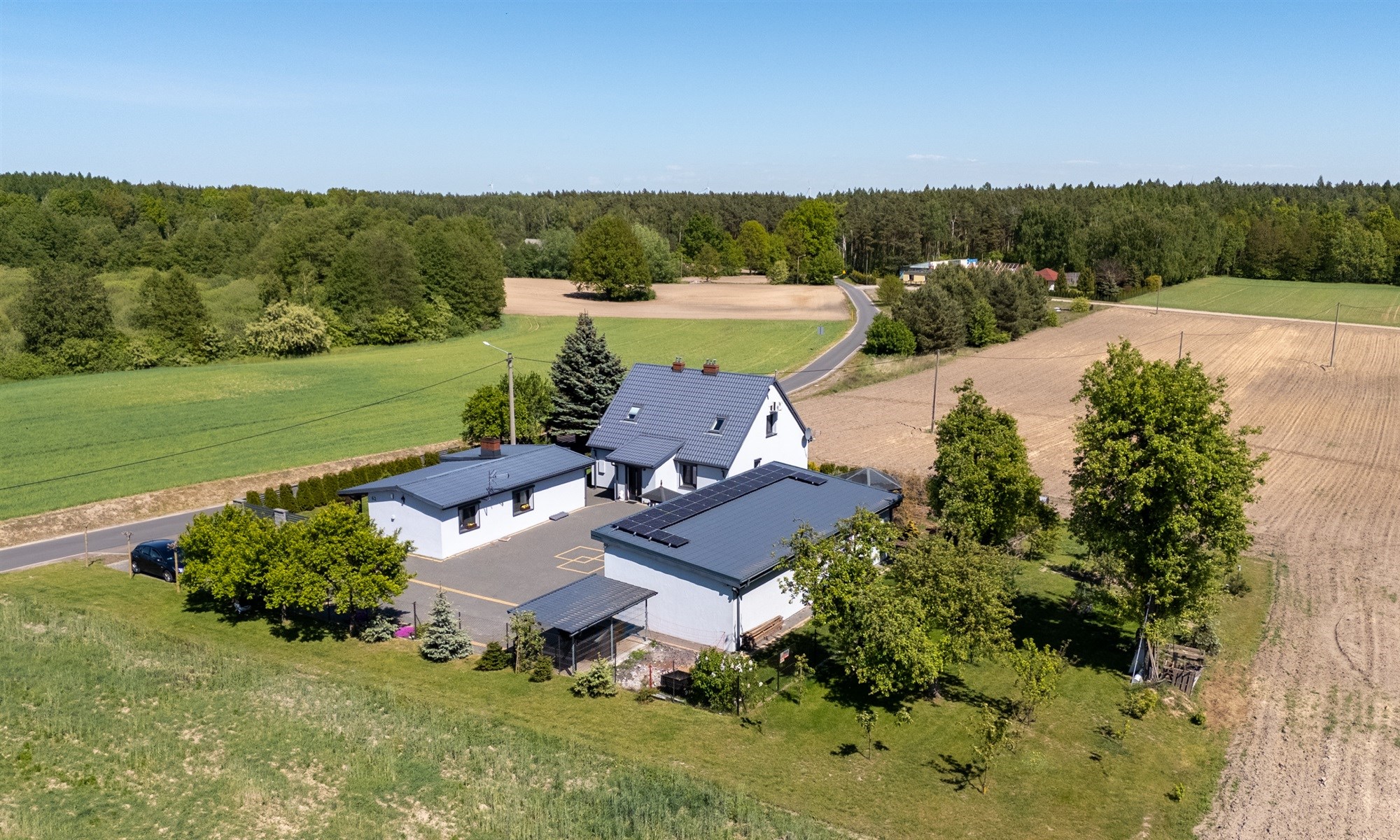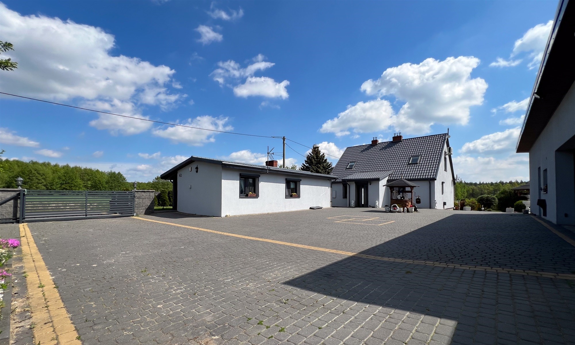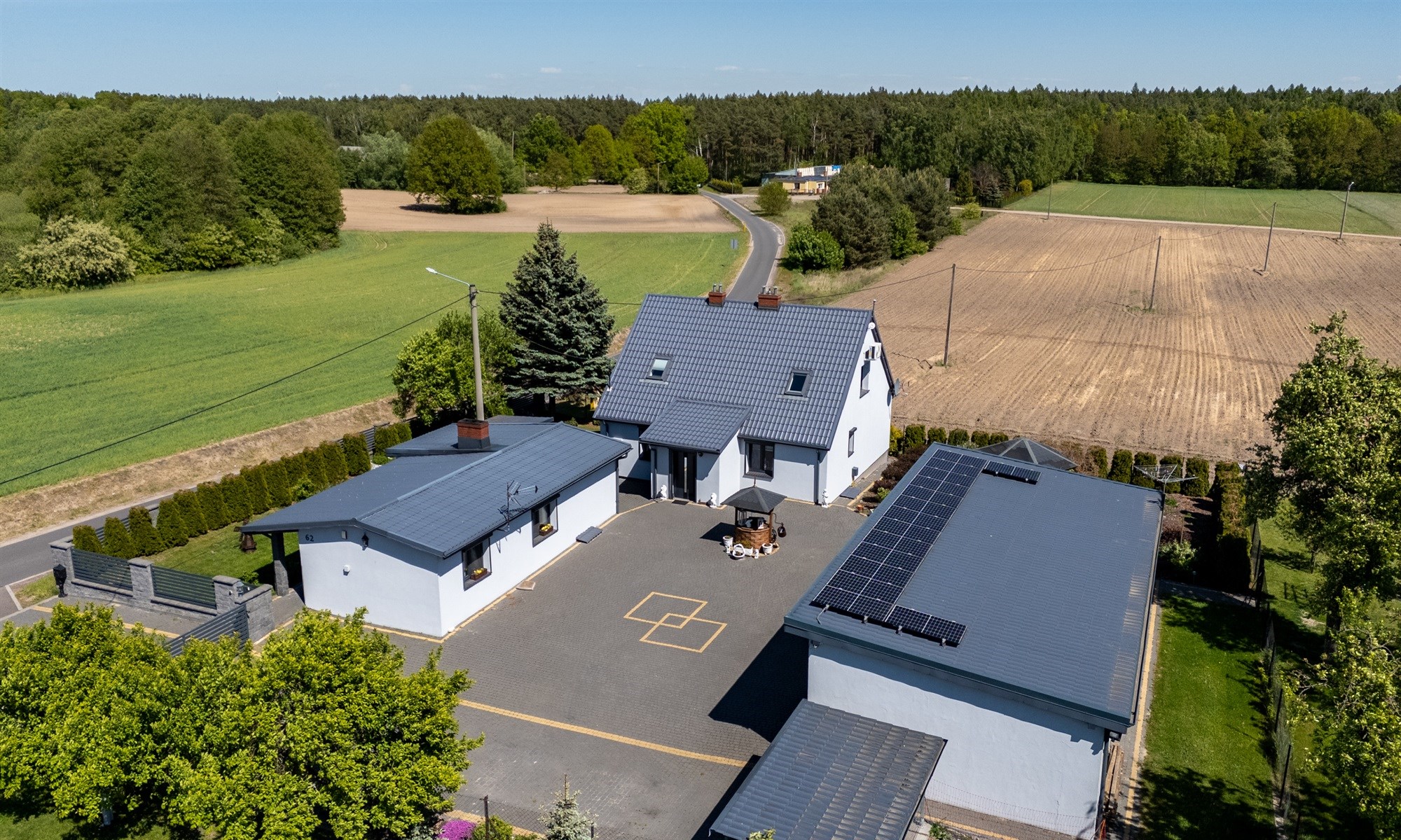 Wkoło budynków znajduje się 8 kamer. Bydynki dodatkowo wyposażone w instalację alarmową. Woda gminna oraz dodatkowo własna studnia.