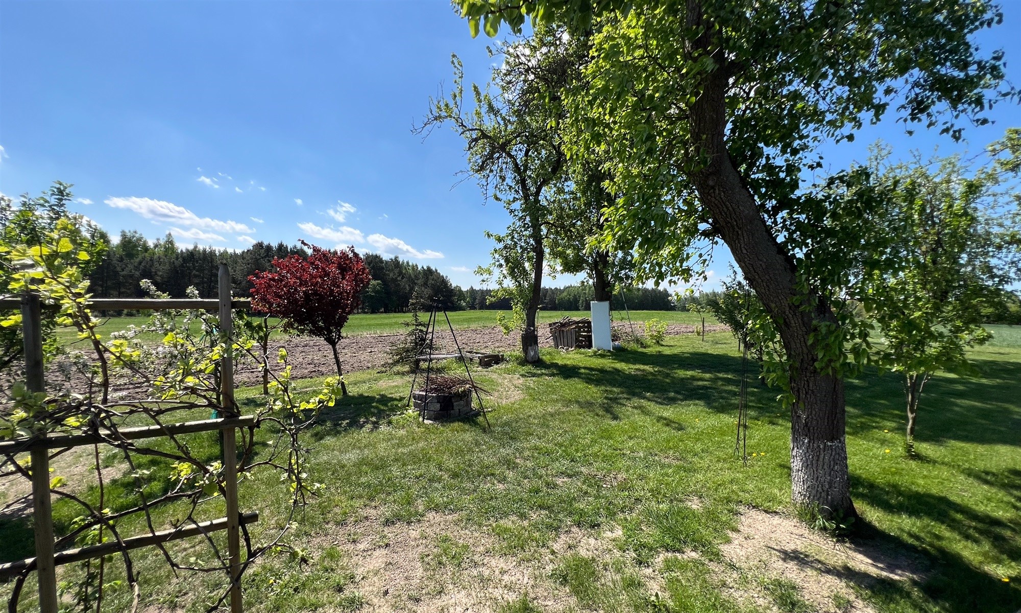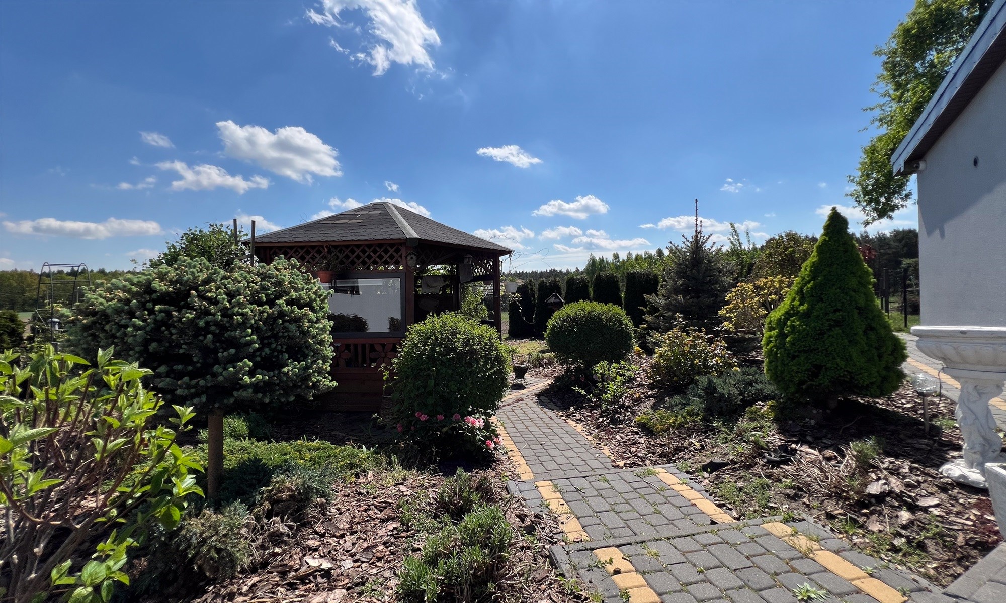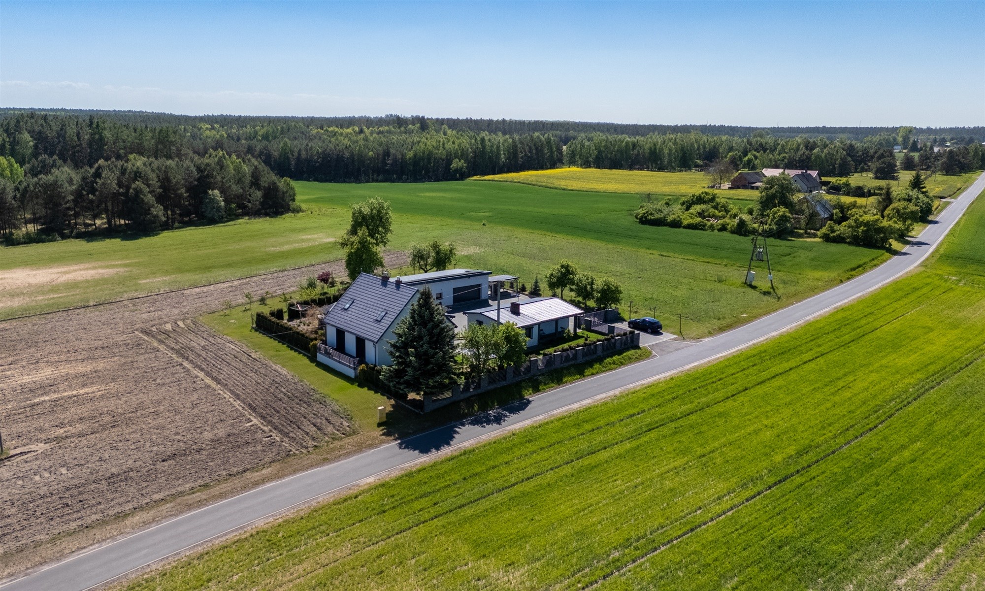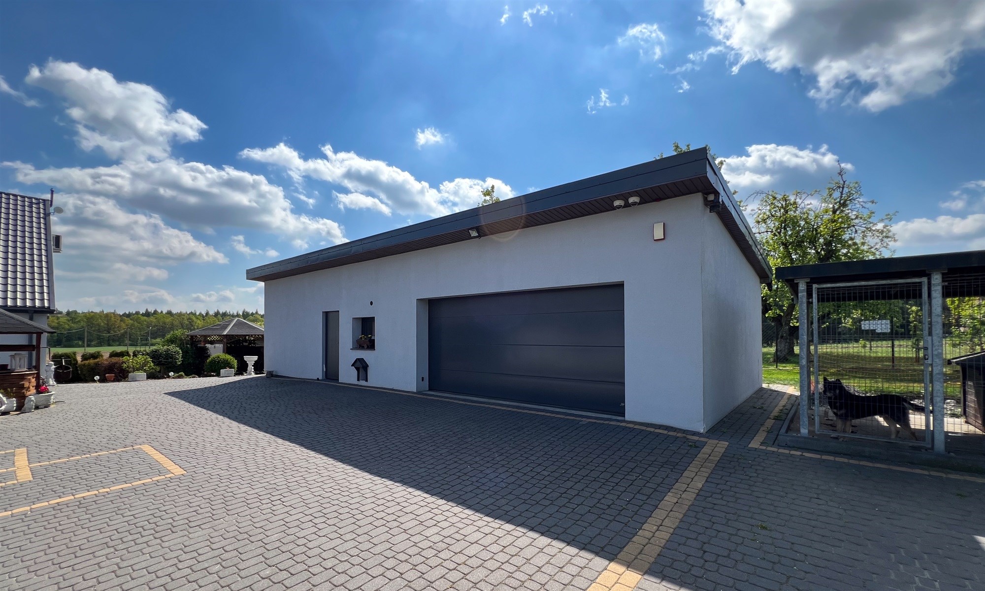 Cała posesja jest bardzo zadbana. Teren pomiędzy budynkami wyłożony kostką (ok 500 m2). Wkoło domu niewielki ogród z trawnikiem i drzewami owocowymi. Cała działka ma powierzchnię 15 800 m2. Ogrodzona została częściowo.