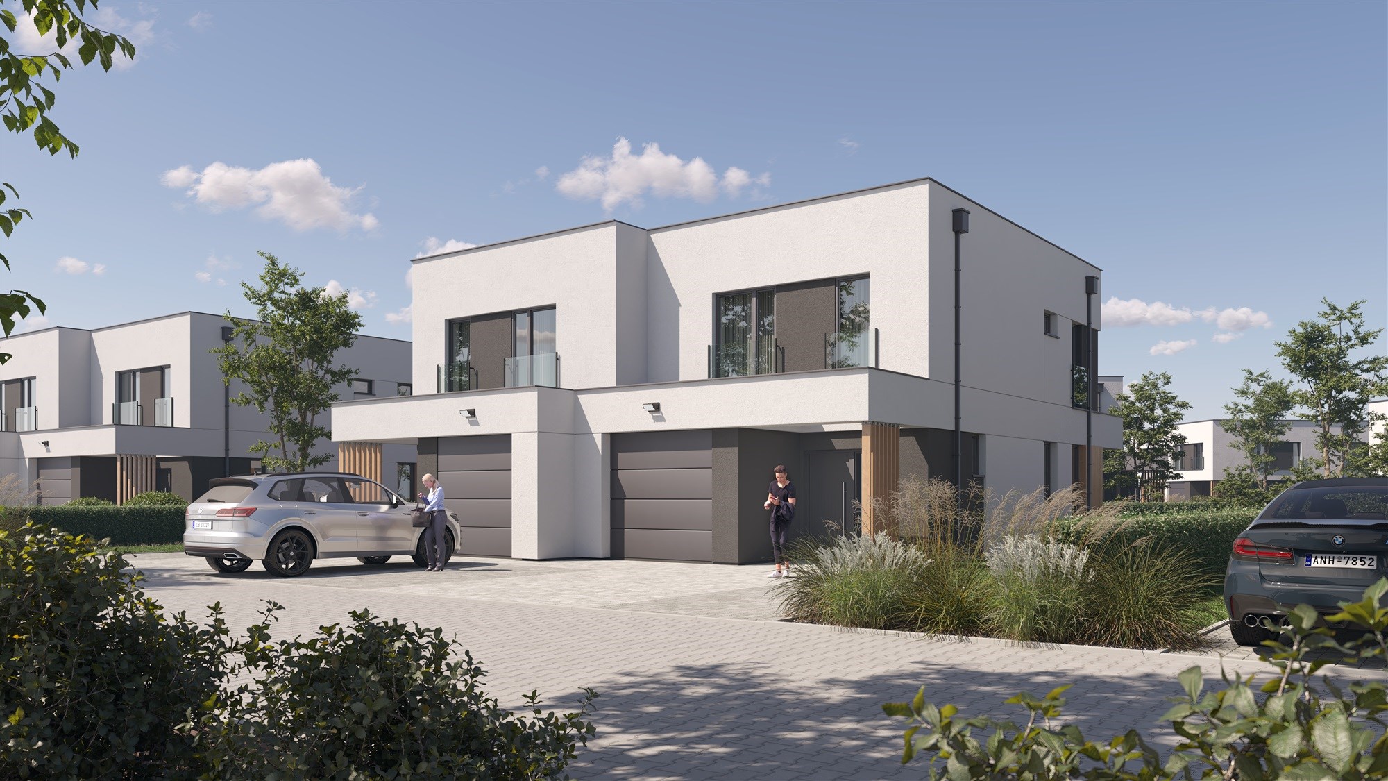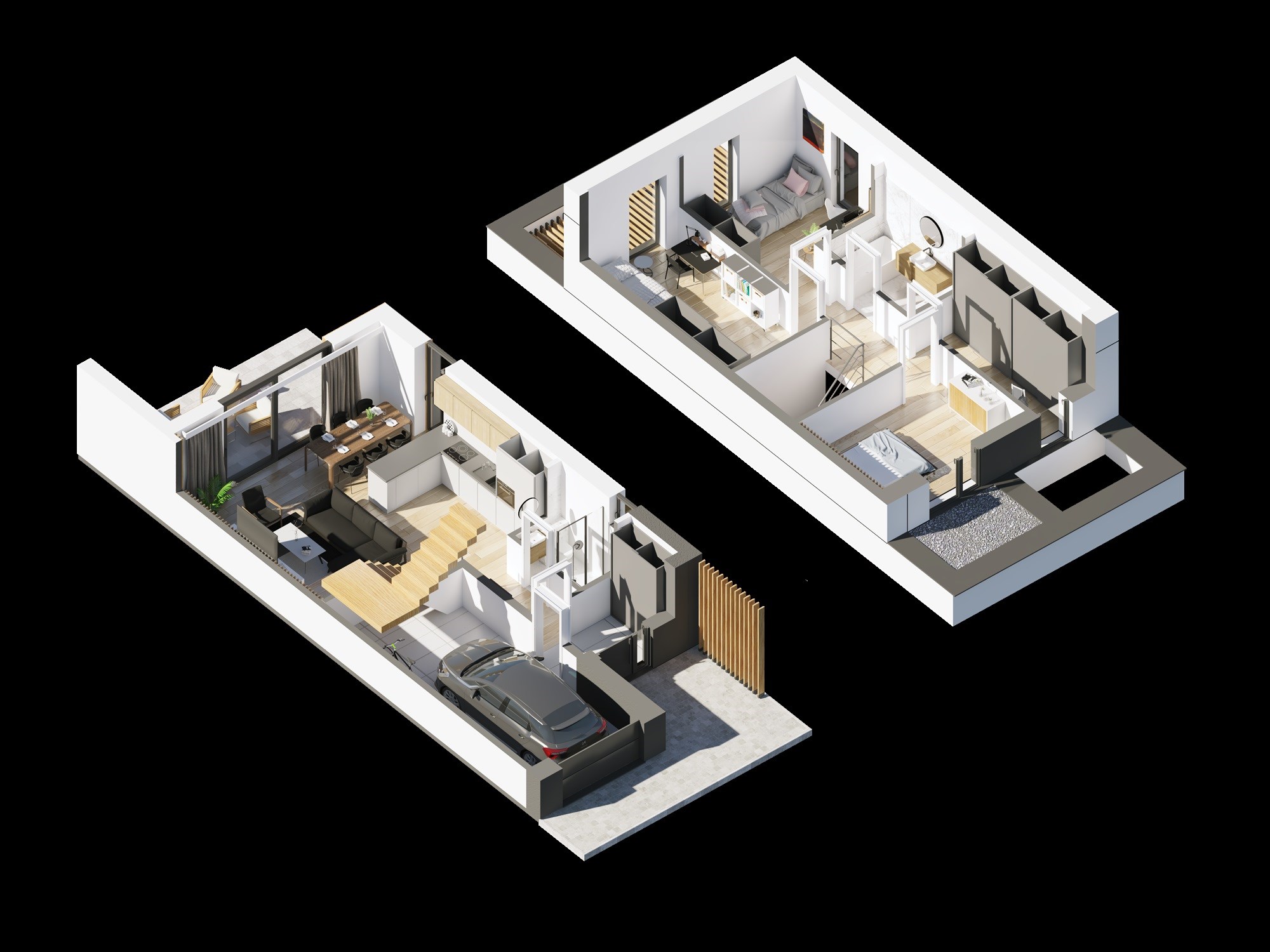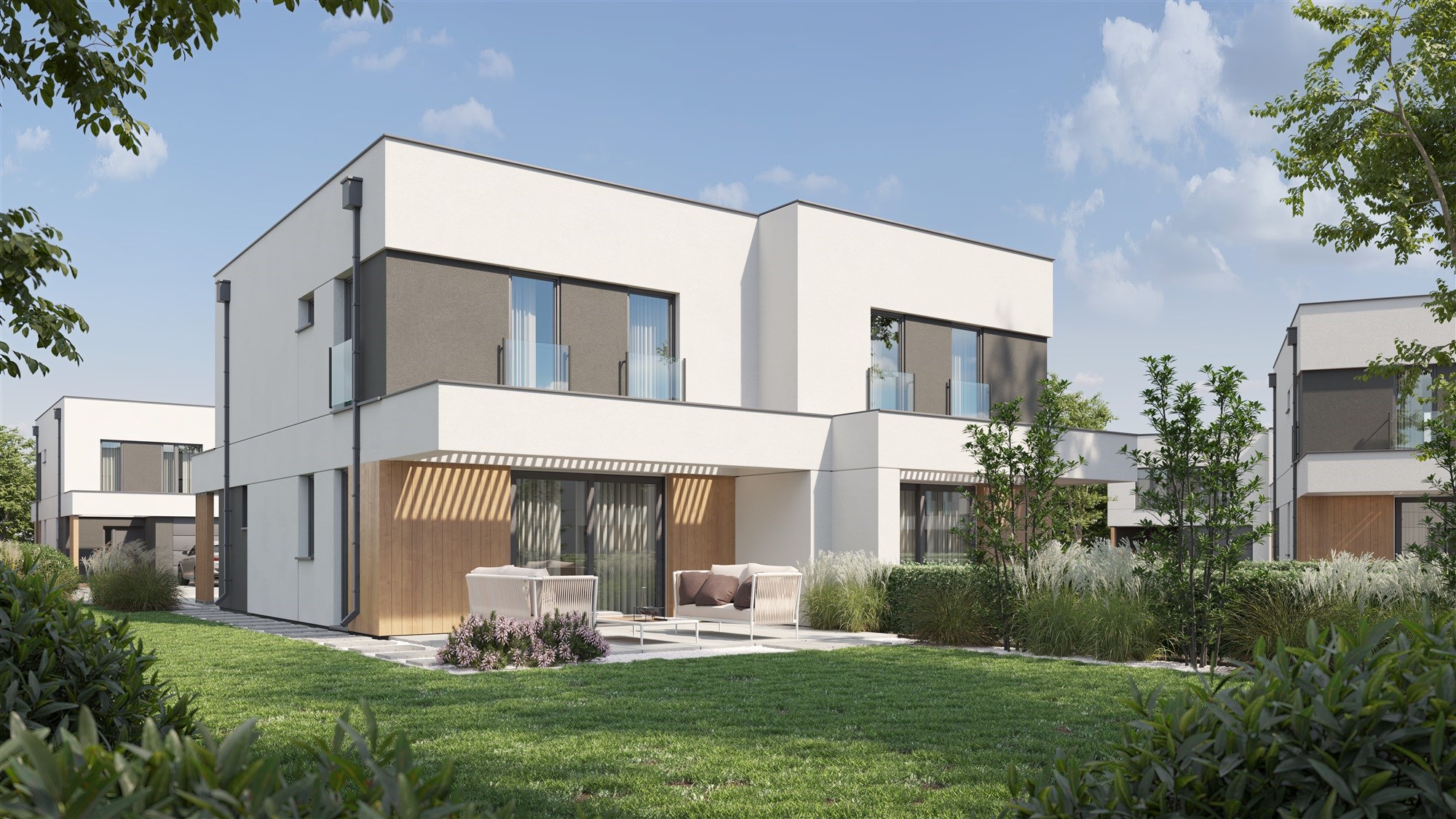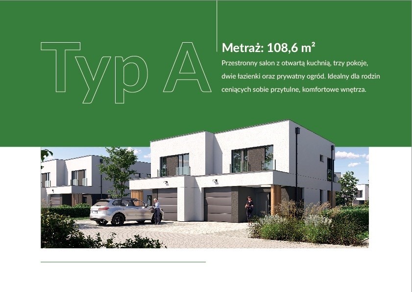 Domy w zabudowie bliźniaczej o powierzchni 108,6 m² (parter + piętro) usytuowane są na działkach od 406m² do 420m².