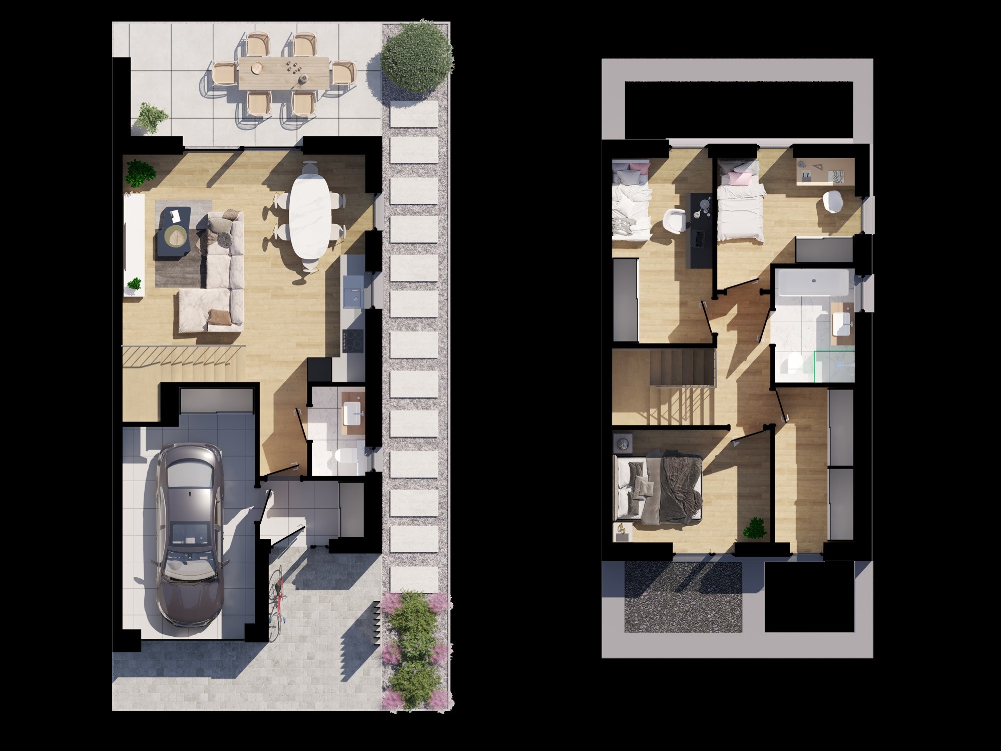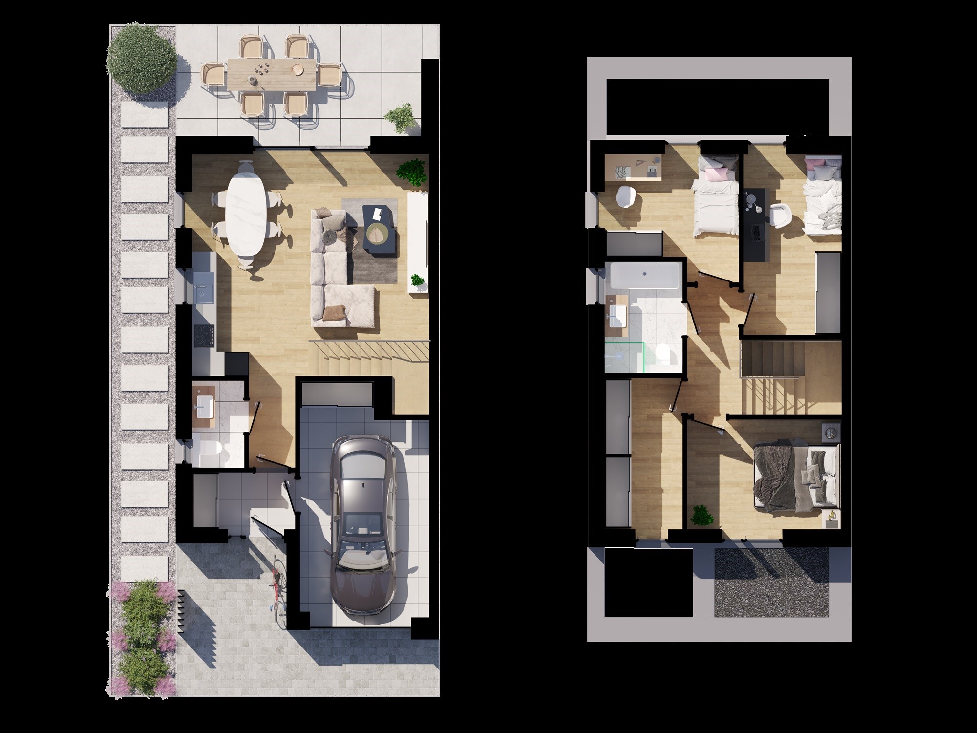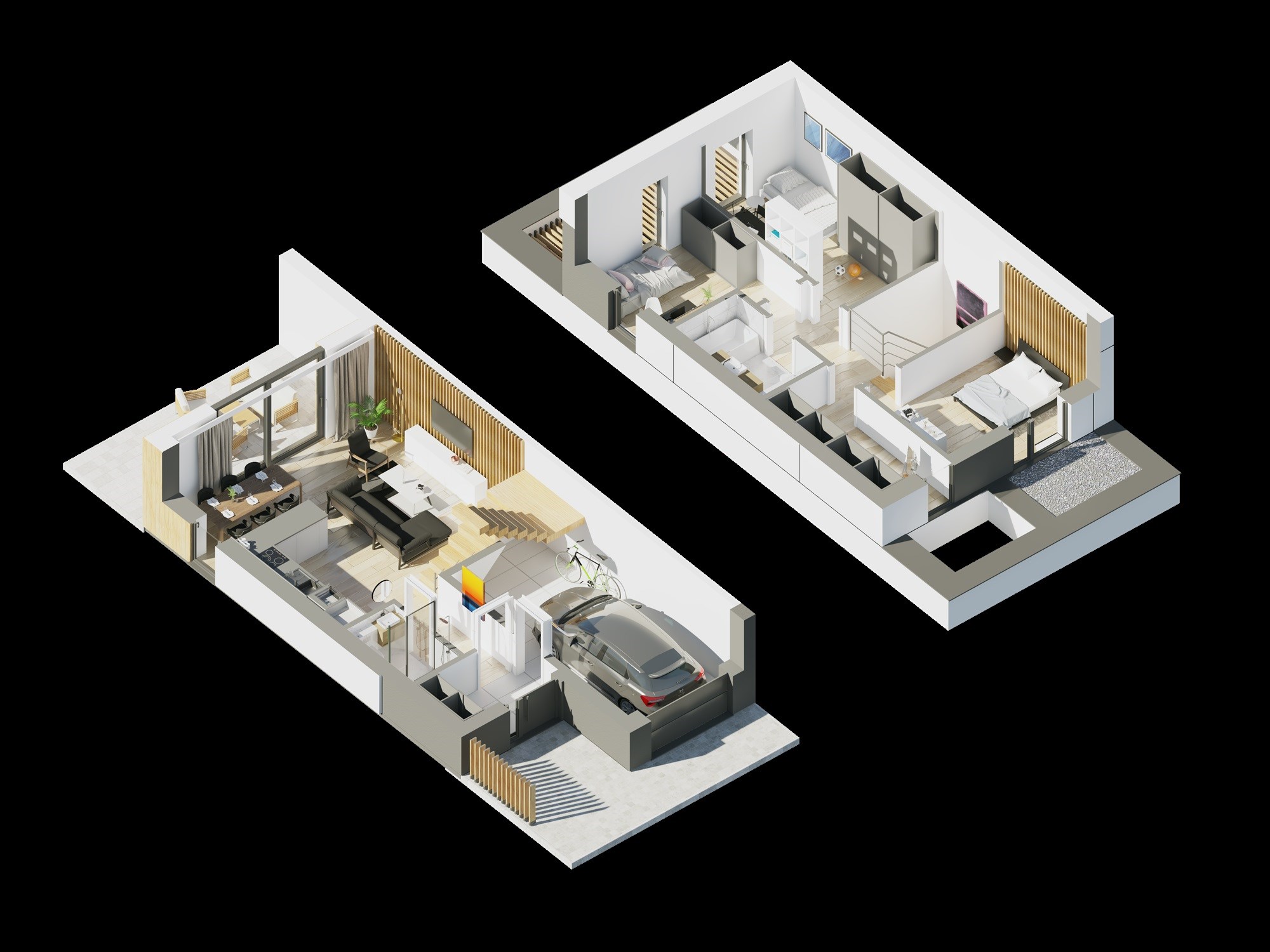 Domy w zabudowie bliźniaczej o powierzchni 108,6 m² (parter + piętro) usytuowane są na działkach od 406m² do 420m².