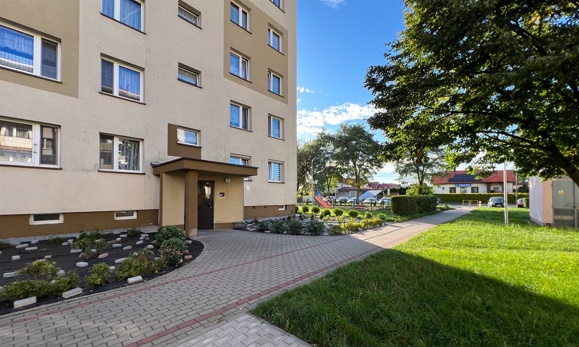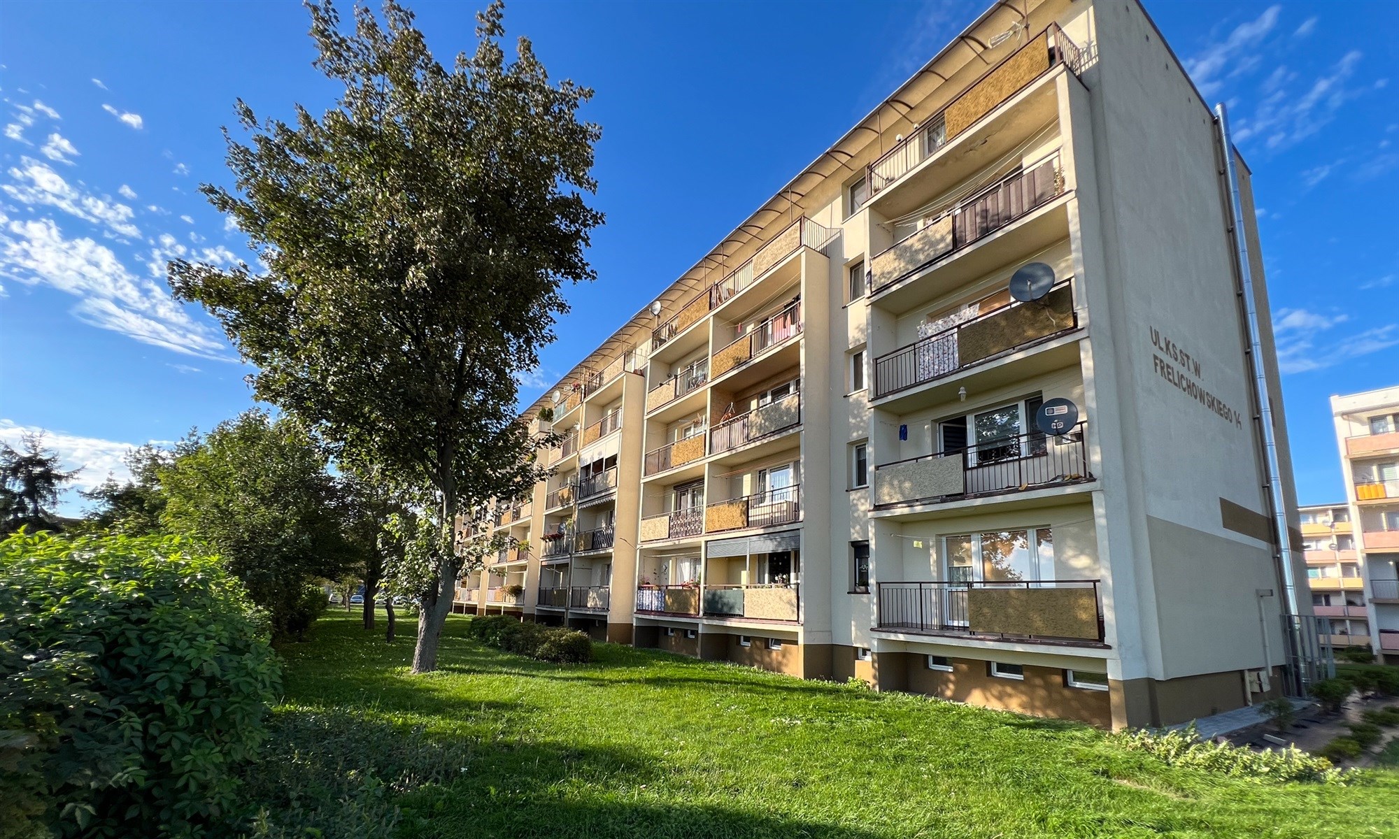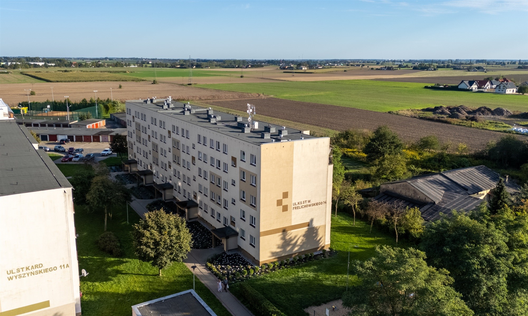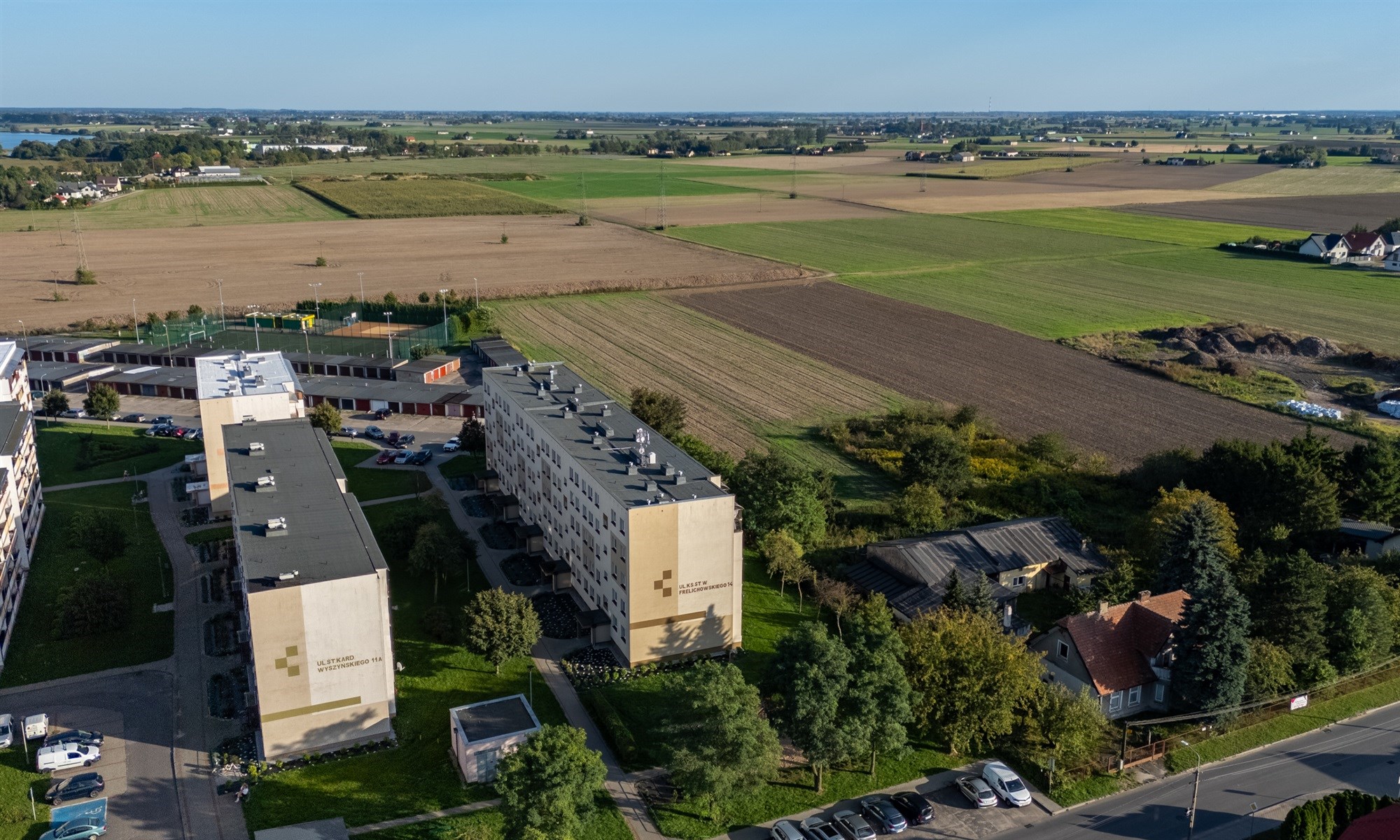 Mieszkanie położone jest w Chełmży, przy ul. Ks. Stefana Frelichowskiego 14. Budynek znajduje się na skraju osiedla, dzięki czemu z balkonu typu loggia możesz codziennie podziwiać piękny widok na okoliczne pola. W najbliższym otoczeniu znajdziesz plac zabaw, boisko sportowe, siłownię zewnętrzną oraz liczne miejsca parkingowe. Całe miasto oferuje pełną infrastrukturę: szkołę, sklepy, szpital, a nawet piękne jezioro, które latem przyciąga mieszkańców na odpoczynek i rekreację.